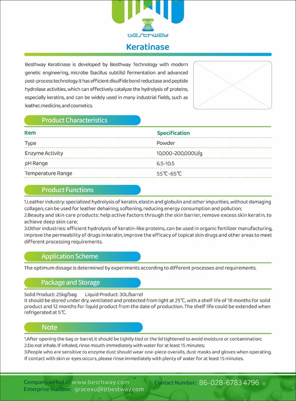 A Besthway Keratinase é desenvolvida pela Besthway Technology com a utilização de engenharia genética moderna, micróbio (Bacillus subtilis) e tecnologia avançada de pós-processamento.Pode catalisar eficazmente a hidrólise de proteínas,especialmente queratinas, e pode ser amplamente usado em muitos campos industriais, como couro, medicina e cosméticos.